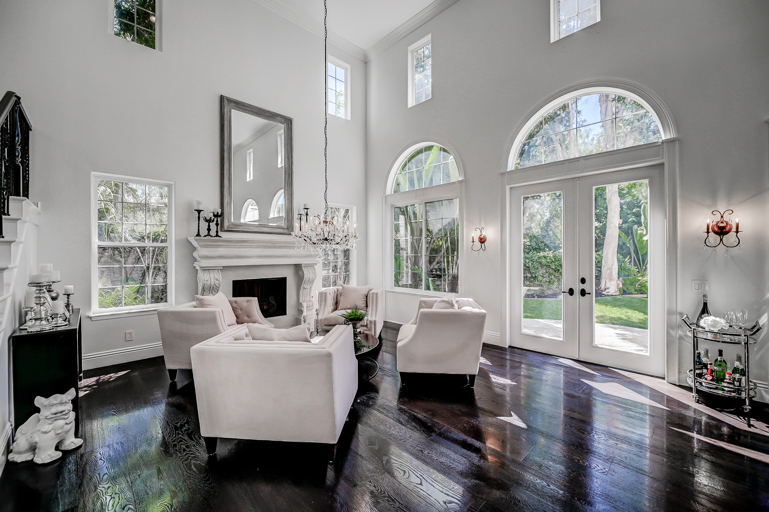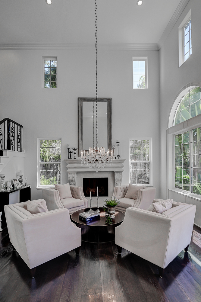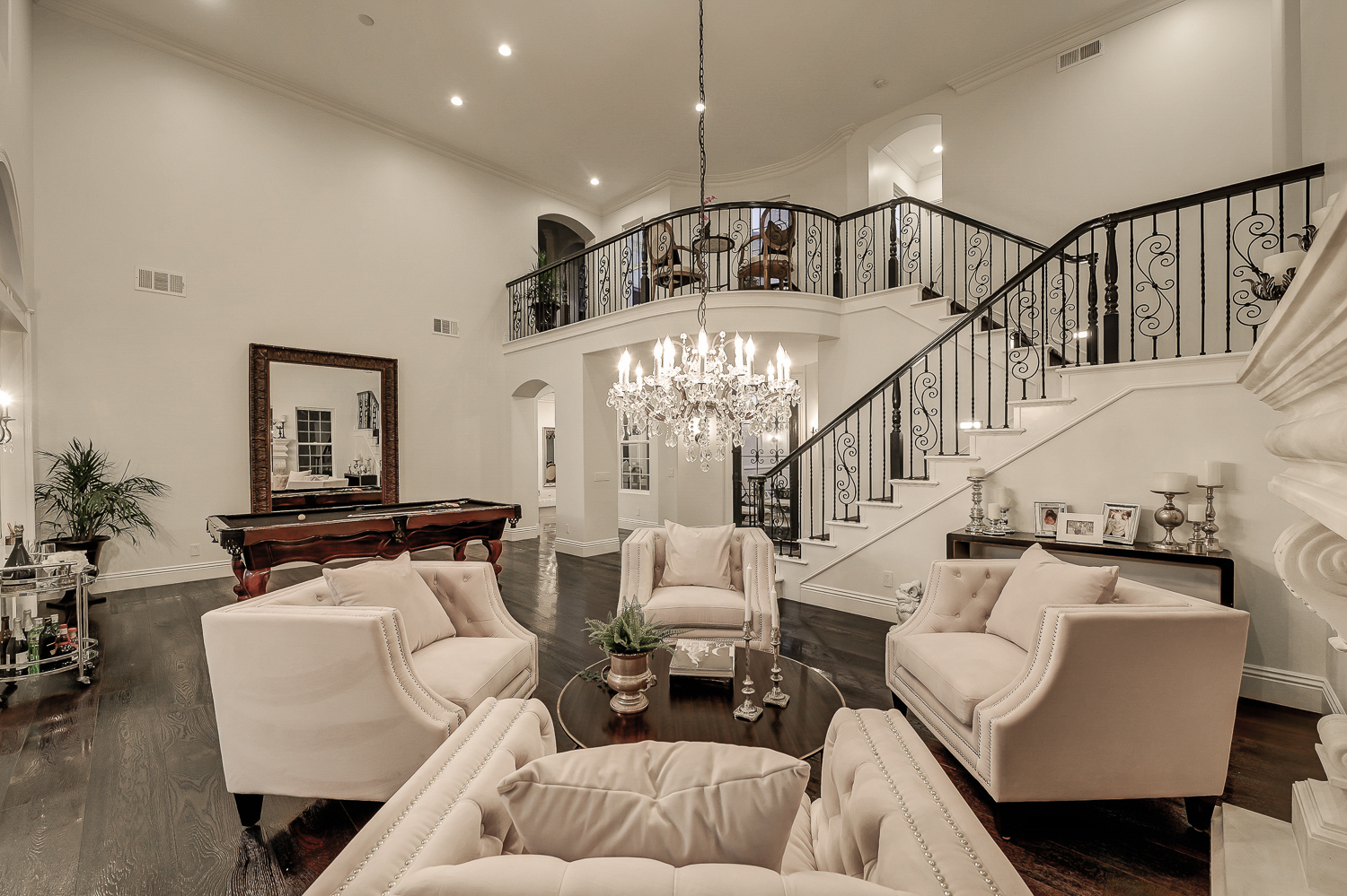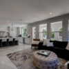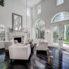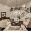 The main level features an ensuite bedroom, guest bath, formal dining, a spacious great room, and a chef’s kitchen with Thermador appliances, a large island, and elegant finishes. Soaring 20-foot ceilings and expansive windows create bright, inviting spaces throughout.
